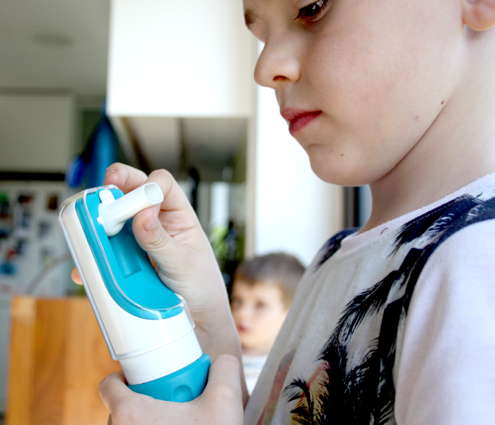 The scenario has been broken down into 8 simple self guided steps. The design reduces the actuation force and allows the child to intuitively actuate the device using a multi-directional sleeve. The mouthpiece folds out for improved lip seal ready for inhalation. The use of haptic feedback patterns helps the child maintain the correct compliance. After inhalation the child can fold down the mouthpiece and twist the cap for storage.