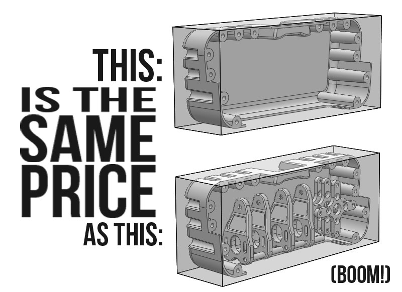 Adding parts into the excess space means that they are effectively free, as they do not add to the original dimensions – there is a minimum part cost per item on the STL, but this is an average, and not an additional cost, so only affects parts with lots of small parts. You can bypass this by spruing them together – see the guide for this below.